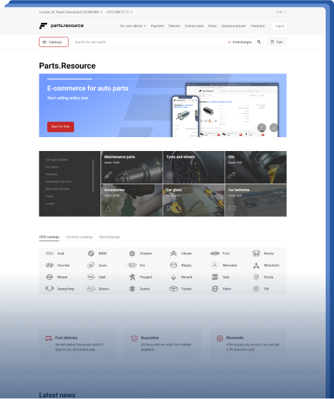 Crear la tienda de autopartes en línea con un poderoso conjunto de funciones es una tarea que se puede resolver mediante el Parts.Resource. Considera completamente la peculiaridad del negocio de venta de autopartes y tiene solicitudes de VIN, intercambios, catálogos de automóviles, conexión a proveedores 'sitios web. Comprar Parts.Resource significa proveer crecimiento y desarrollo de su negocio.